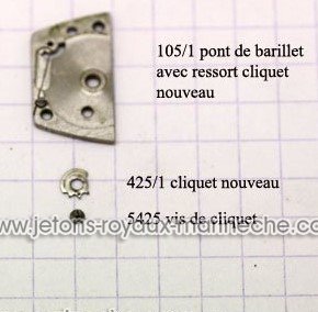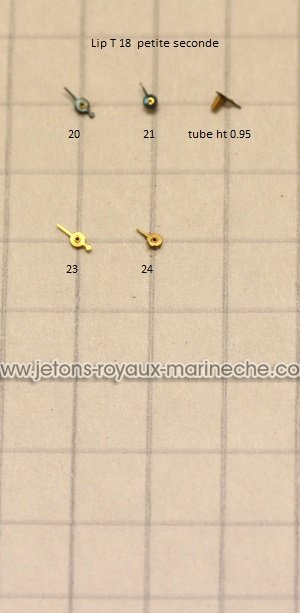 pièces détachées LIP T 18 = 100 platine=25; 105/1 pont de barillet=30; 110 pont de rouage=25; 121 pont de balancier complet=35; 125 pont d'ancre=15; 180/22 barillet complet=45; 201 roue de centre=26; 210 roue de moyenne =15; 220 roue de seconde pivot long= 48; 240 chaussée =16; 250 roue de heures=10; 260 roue de minuterie=1; 260/1 pont de minuterie =12; 401 tige=5; 407 coulant=15; 410 pignon de remontoir=15; 415 rochet=15; 420 roue de couronne=15; 422 noyeau=6; 425 cliquet=10; 430 ressort de cliquet=5; 435 bascule=5; 440 ressort de bascule=5; 443 tirette=14; 445 frein de tirette=12; 450 renvoi=5; 702 roue d'ancre=15; 710 ancre=15; 721 balancier complet 80; 723 axe de balancier origine=10; 730 plateau =15; 770 ressort de barillet =25; 5180 vis arbre de barillet=15; 5420 vis roue de couronne=15; 5425 vis cliquet=10; 5443 vis tirette =10;