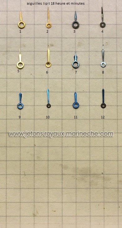 Lip T 18 Aiguille heure ou minute N°1 heure jaune=20€; N°2 minute jaune=20€; N°3 heure acier bleu=20€; N°4 minute acier bleu=20€; N°5 heure jaune=20€; N°6 minute jaune=20€; N°7 heure acier bleu=20€; N°8 minute acier bleu=20€; N°9 heure acier bleu=20€; N° 10 minute acier bleu=20€; N°11 heure acier bleu =20€; N°12 minute acier bleu=20€;