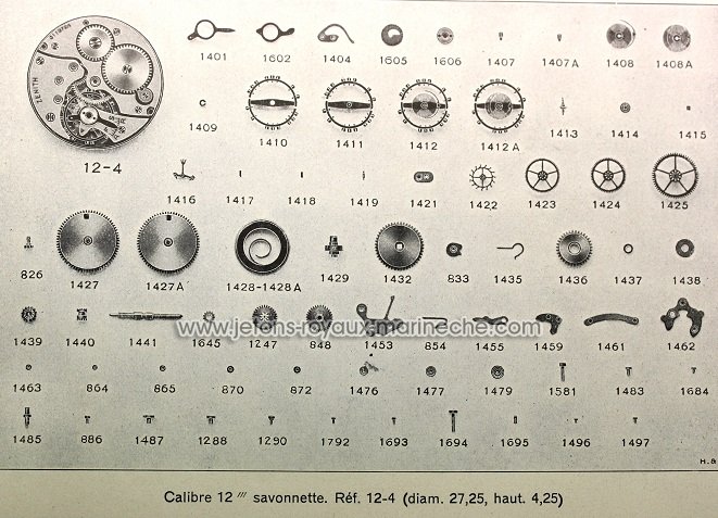 Zeniht 12-4. attention que ces pièces son disponibre. platine nue=60€; pont de barillet nu=80€; pont de rouage empierré=70€; pont de balancier complet avec incabloc=95€; 1401 raquette=40€; 1412 balancier copmlet avec piton spiral plat hh 360=130€; 1413 axe d'origine ht 360=20€; 1414 plateau=60€; 1422 roue d'échappement=80€; 1423 roue de seconde sans le pivot=48€; 1424 roue de moyenne=70€; 1425 roue de centre=90€; 826 chaussée=50€; 1427 barillet avec couvercle et le ressort avec bride a ailette=85€; 1429 arbre de barillet=45€; vis d'arbre=24€; 1432 rochet de barillet=45€; 833 cliquet avec bec=45€; 1435 ressort avec crochet=32€; 1436 rochet de couronne=65€; 1437 noyeau=35€; vis a gauche pour le rochet de couronne=35€; 1441 tige carré 0.84=20€; 1459 tirette seule=48€; vis a poussette=20€; 1461 ressort plat=26€; vis de maitient du ressort=20€; 1427 roue de minuterie=40€;