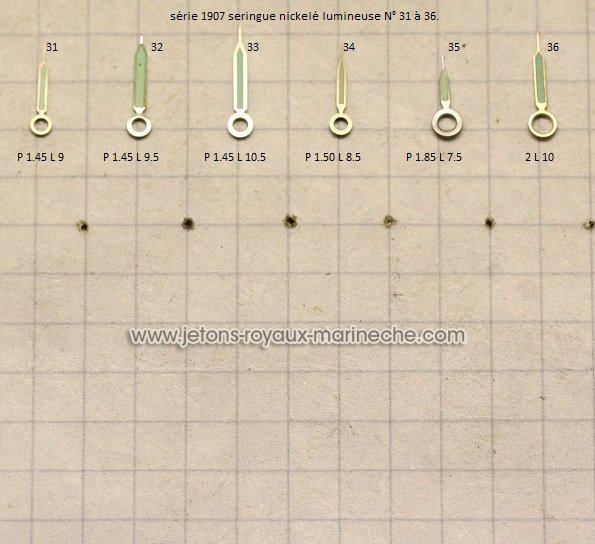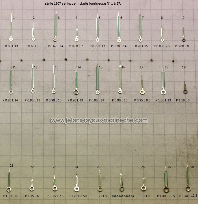 Aiguilles seringue, nickelé, lumineuse, une aiguille 15 €.série 1907. n° 1 à 37.
