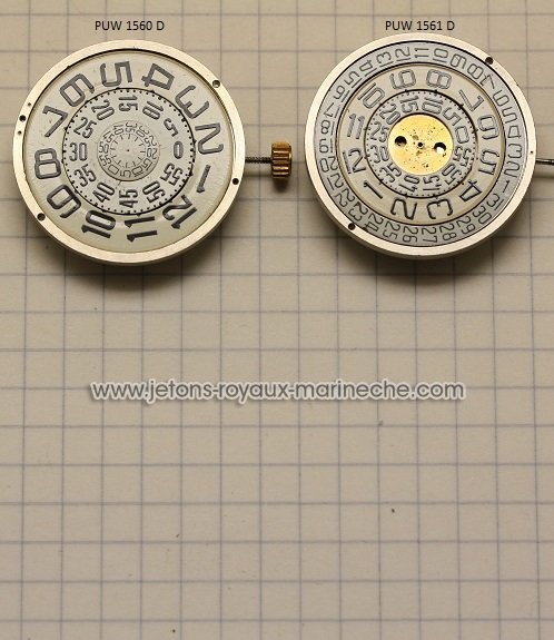 Puw 1561 100 platine empierée=90€; 118 pont de rouage combiné empierré=54€; 118/1 pont de rouage complet=85€; 121 pont de balancier complet avec bloc incabloc=78€; 125 pont d'ancre=15€; 126 barrette de roue de centre=28€; 181/1 barillet complet avec ressort axe monté=70€; 181 barillet=30€; 197/1 bonde et rochet rivé axe monté=22€; 201 roue de centre percée sans chaussée=25€; 219 roue de moyenne pour 2 contre-pivot=25€; 227 roue de seconde au centre ht613=28€; 245 chaussée pour seconde au centre ht179=25€; 260 roue de minuterie=20€; 301 raquette mobile pour spiral plat=23€; 324 bloc incabloc, dessus=25€; 325 bloc incabloc dessous =25€; 364 piton mobile pour spiral plat=23€; 370 bloc dessus=35€; 371 bloc dessous=35€;dessus=25€; 401. tige de remontoir=10€; 407 pignon coulant=15€; 410 pignon de remontoir=15€; 420 roue de couronne=25€; 422 noyeau=10€; 425. cliquet =15€; 5425 vis pour cliquet=18€; 430. ressort de cliquet=12€; 435 bascule=10€; 440 ressort de bascule=10€; 443 tirette a poussette=22€; 445 ressort de tirette spécial=22€; 451 renvoi=14€; 702 roue d'ancre pivotée pour 2 contre-pivots=30€; 710. ancre=35€; 721/0 balancier sans vis complet=60€; 723 axe de balancier=10€; 730. plateau=24; 770 ressort de barillet=35€;