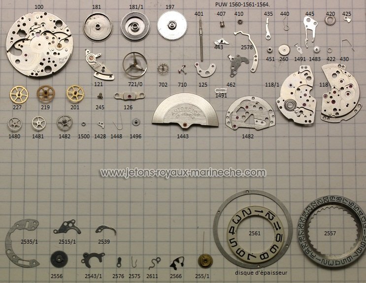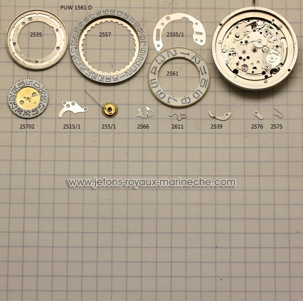 Puw 1561D quantième avec visualisation de l'emplacement de pièces. 255/1 mobile entrainement des mois=70€; 2535 plaque de maintient=35€; 2535/1 plaque protection cliquet 2576 et son ressort=40€; 2511/1 plaque de protecion=30€; 2557 dique des jours=75€; 2561 disque des mois75€; 2566-2611-2539=25€ pièce; 2575 ressort du cliquet=10€; 276 cliquet=15€25702 disque des secondes=75€;