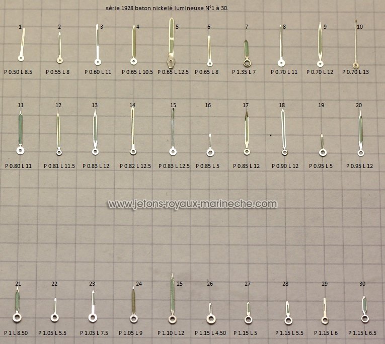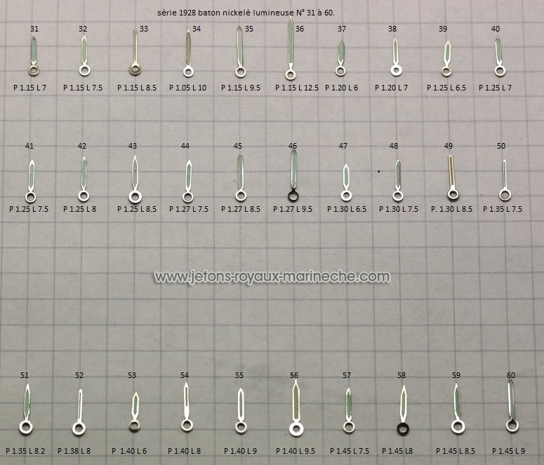 Aiguilles bâton nickelé lumineuse, une aiguille 15 €. série 1928 N°1 à 75.