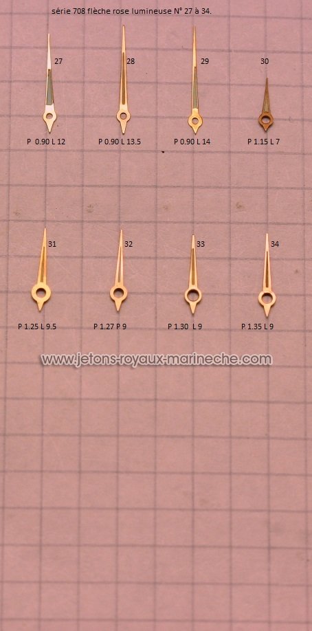 Vous êtes ici : Accueil Horlogerie Aiguilles flèche, rosé, lumineuse une aiguille 15€ €.série 708.N°0 à 34.