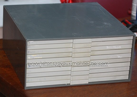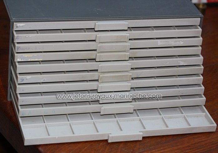 poids 4.500 kg sans contenu - Gris - 10 tiroirs de 64 compartiments 33x33 mm. pour 640 monnaies; reste 6 a vendre. possible de prendre sur place.