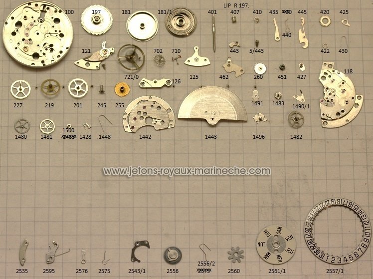 Lip R 197. 100 platine empierée=90€; 118 pont de rouage combiné empierré=54€; 121 pont de balancier complet avec bloc incabloc=68€; 125 pont d'ancre=15€; 126 barrette de roue de centre=28€; 181/1 barillet complet avec ressort axe monté=70€; 181 barillet=30€; 197/1 bonde et rochet rivé axe monté=22€; 201 roue de centre percée sans chaussée=25€; 219 roue de moyenne pour 2 contre-pivot=25€; 227 roue de seconde au centre ht613=28€; 240 chaussée pour seconde au centre ht278=25€; 255. roue des heures ht320=25€; 260 roue de minuterie=20€; 301 raquette mobile pour spiral plat=23€; 324 bloc incabloc, dessus=25€; 325 bloc incabloc dessous =25€; 364 piton mobile pour spiral plat=23€; 370 bloc dessus=35€; 371 bloc dessous=35€;dessus=25€; 401. tige de remontoir=10€; 407 pignon coulant=15€; 410 pignon de remontoir=15€; 420 roue de couronne=25€; 422 noteau=10€; 425. cliquet =15€; 427 rivet pour cliquet=25€; 430. ressort de cliquet=12€; 435 bascule=10€; 440 ressort de bascule=10€; 443 tirette=20€; 5443 vis=12€; 445 ressort de tirette=18; 451 renvoi=14€; 702 roue d'ancre pivotée pour 2 contre-pivots=30€; 710. ancre=35€; 721/0 balancier sans vis complet=60€; 723 axe de balancier=10€; 730. plateau=24; 770 ressort de barillet=35€;
