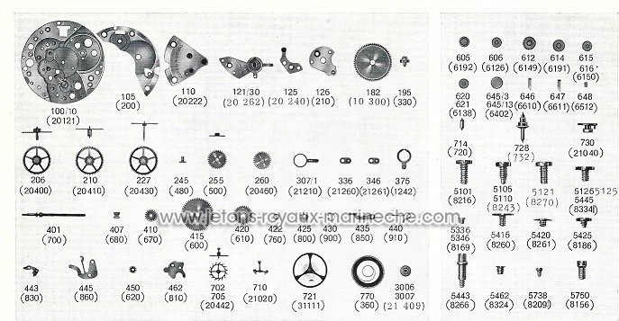 pièces détachées dédié au calibre R 557.. 100 platine empierré avec bolc incabloc=40€; 105 pont de barillet nu=25€; 110 pont de rouage empierré=25€; 121 pont de balancier complet avec bloc et raquette et piton mobile=35€; 125 pont d'ancre=15€; 126 barett de roue de centre=25€; 180/22 barillet complet avec ressort=35€; 182 barillet avec couvercle=17€; 195 arbre de barillet=15€; 206 roue de centre percée=22€; 210 roue de moyenne=15€; 227 roue de seconde au centre=25€; 245 chaussée=13€; 255 roue de heures=10€; 260 roue de minuterie=15€; 307 raquette=15€; 336 plaque c-p dessus pour roue d'ancre=15€; 346 plaque c-p dessous pour roue d'ancre=15€; 375 porte piton mobile=20€; 401 tige de remontoir d'origine=7€; 407 pignon coulant=12€; 410 pignon de remontoir=13€; 415 rochet de barillet=10€; 420 roue de couronne=12€; 422 noyau=8€; 425 cliquet=10€; 430 ressort de cliquet=8€; 435 bascule=8€ 440 ressort de bascule=8€; 443 tirette=12€; 445 ressort de tirette=30€; 450 renvoi acier=8€; 702 roue d'ancre pour deux contre-pivots rare=65€; 705 roue d'ancre normale= 15€; 710 ancre=25€; 721 balancier=20€; 728 axe de balancier=8€; 730 plateau=18€; 770 ressort de barillet=15€; 3006/3007 dispositif amortisseur pièce=25€; 5110/ 5115/ 5122/ vis de pont=5€; 5125 vis pont d'ancre=6€; 5195 vis arbre de barillet=11€; 4420 1 vis roue de couronne=12€; 5425 vis de cliquet=5€; 5443 vis de tirette=8€;