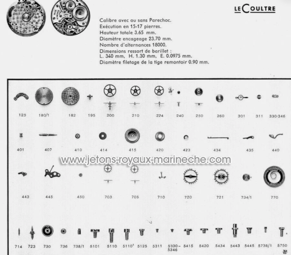 100 platine complète=90€; 105 pont de barillet nu=65€; 110 pont rouage complet=50€; 116 pont d'ancre=45€; 123 coq complet avec raquette kif=125€; 125 pont d'ancre=35€; 180/1 barillet complet avec couvercle et ressort a bride a ailettes=100€; 201 roue de centre sans chaussée=68€; 205 roue de centre percée cal 800 sans chaussée=110€; 210 roue de moyenne=45€; 214 roue de moyenne long pivot cal 800=85€; 220 roue de seconde= 60€; 243/1 chaussée non percée =45€; 245 chaussée pour seconde au centre cal 800=90€; 250 roue des heures=35€; 260 roue de minuterie=35€; 275/1 pignon de seconde au centre sans pivot cal 800=75€; 283 roue entraineuse sur roue de moyenne cal 800=70€; 301 raquette=45€; 324 bloc incabloc dessus=52€; 325 bloc incabloc dessous=52€; 401 tige de remontoir=35€; 407 pignon coulant=45€; 410 pignon de remontoir=45€; 415 rochet=45€; 420 roue de couronne=55€; 430 ressort cliquet=40€; 415 rochet de barillet=35€; 434 cliquet ressort=40€; 435 bascule=25€; 443 tirette=55€; 5443 vis de tirette=35€; 445 frein de tirette=50€; 450 renvoi=38€; 471 ressort-friction du pignon de seconde au centre cal 800=40€; 705 roue d'ancre=135€; 710 ancre=75€; ; 721 balancier complet=240€; 723 axe de balancier=30€;